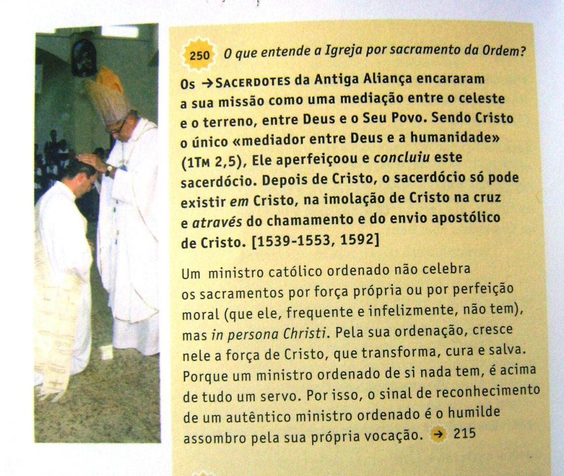 YouCat responde: “Os Sacerdotes da Antiga Aliança encararam a sua missão como uma mediação entre o celeste e o terreno, entre Deus e o Seu Povo. Sendo Cristo o único ‘mediador entre Deus e a humanidade’ (1Tm 2,5), Ele aperfeiçoou e concluiu este sacerdócio. Depois de Cristo, o sacerdote só pode existir em Cristo, na imolação de Cristo na cruz e através do chamamento e do envio apostólico de Cristo”. [1539-1553,1592].