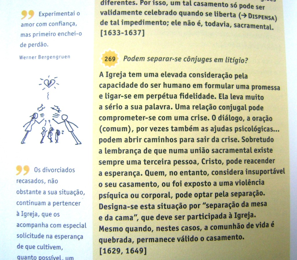 “Os divorciados recasados, não obstante a sua situação, continuam a pertencer à Igreja, que os acompanha com especial solicitude na esperança de que cultivem, quanto possível, um estilo cristão de vida, através da participação na Santa Missa, ainda que sem receber a comunhão, da escuta da palavra de Deus, da adoração eucarística, da oração, da cooperação na vida comunitária, do diálogo franco com um sacerdote ou um mestre de vida espiritual, da dedicação ao serviço da caridade, das obras de penitência, do empenho da educação dos filhos.” Bento XVI, Sacramentum caritatis, n.º 29.